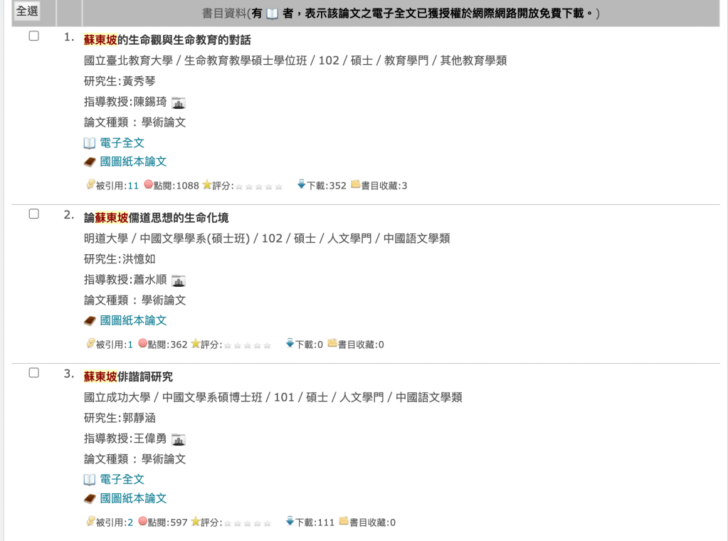 另外有很多人會想詢問的是,不知道「研究題目」怎麼定要怎麼辦?建議可以先從自己「可能有興趣」的方向著手,譬如在中文系的四年裡,我可能對宋詞較有共鳴,又特別喜歡蘇東坡,就可以在碩博士論文網裡,找找到底有哪些相關的論文主題已經被研究,又有哪些可以是再加以延伸的。